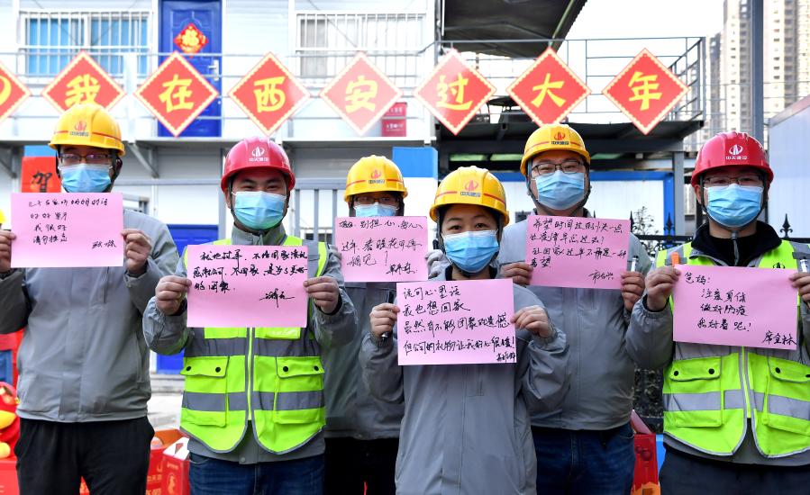 2月1日,在西安中天西北集團(tuán)一住房項目建設(shè)工地,建設(shè)者寫下自己想對家人說的話。新華社記者 劉瀟 攝