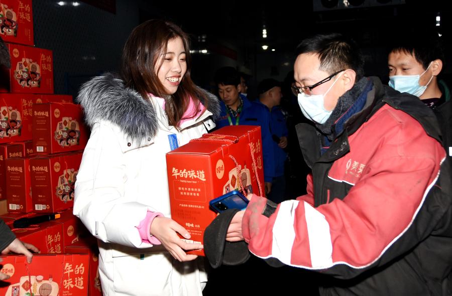 1月31日,北京昌平的一家民營企業(yè)糧食蔬菜倉儲車間內(nèi),留守崗位、“就地過年”的員工(右)在領(lǐng)取春節(jié)慰問品。新華社記者 潘旭 攝