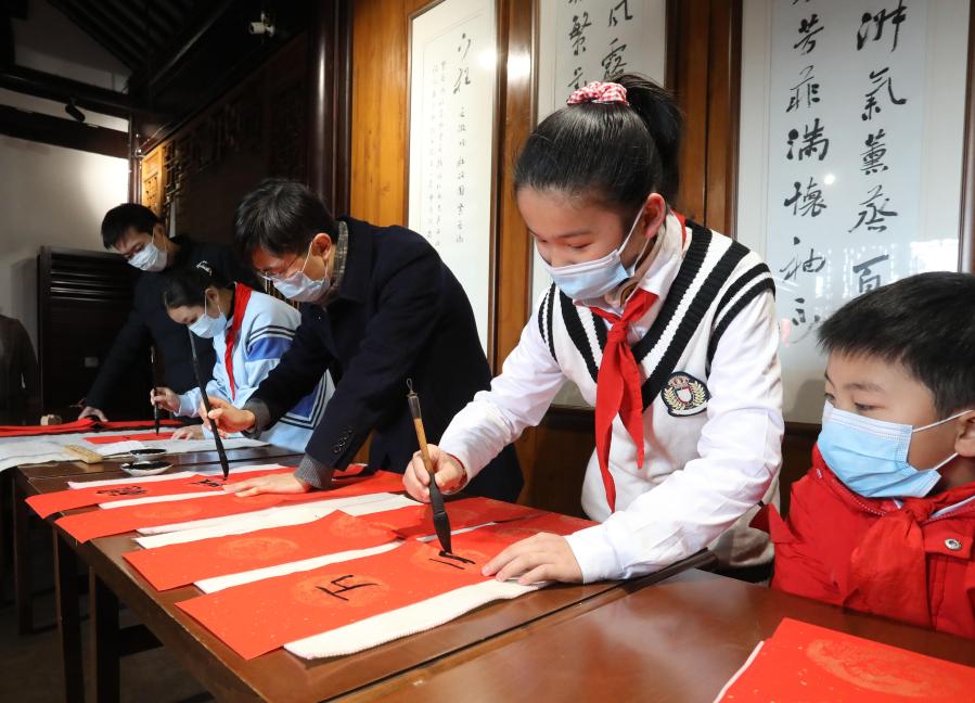 1月30日,江蘇蘇州園林博物館舉辦的“蘇州年 園林味”主題活動啟動,10個就地過年的家庭成為首批體驗者,孩子們與志愿者一起書寫春聯(lián)。新華社發(fā)(杭興微 攝)
