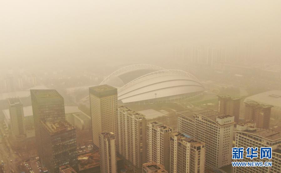 這是3月15日拍攝的遼寧省沈陽市奧體中心體育場(無人機照片)。當(dāng)日,我國北方多地出現(xiàn)沙塵天氣。新華社記者 楊青 攝