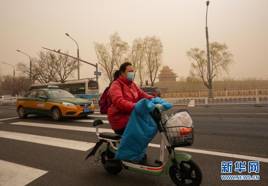 3月15日,市民騎車從北京故宮角樓附近經(jīng)過。當(dāng)日,我國(guó)北方多地出現(xiàn)沙塵天氣。新華社記者 陳曄華 攝