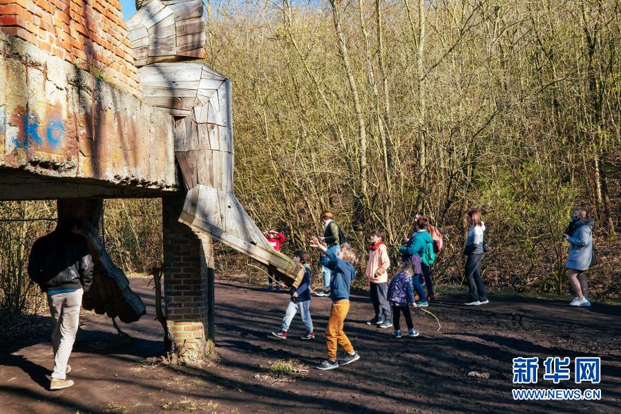 3月20日,人們在比利時博姆市的德舒爾森林公園和一座“巨人”雕塑“玩?!薄P氯A社記者 張鋮 攝