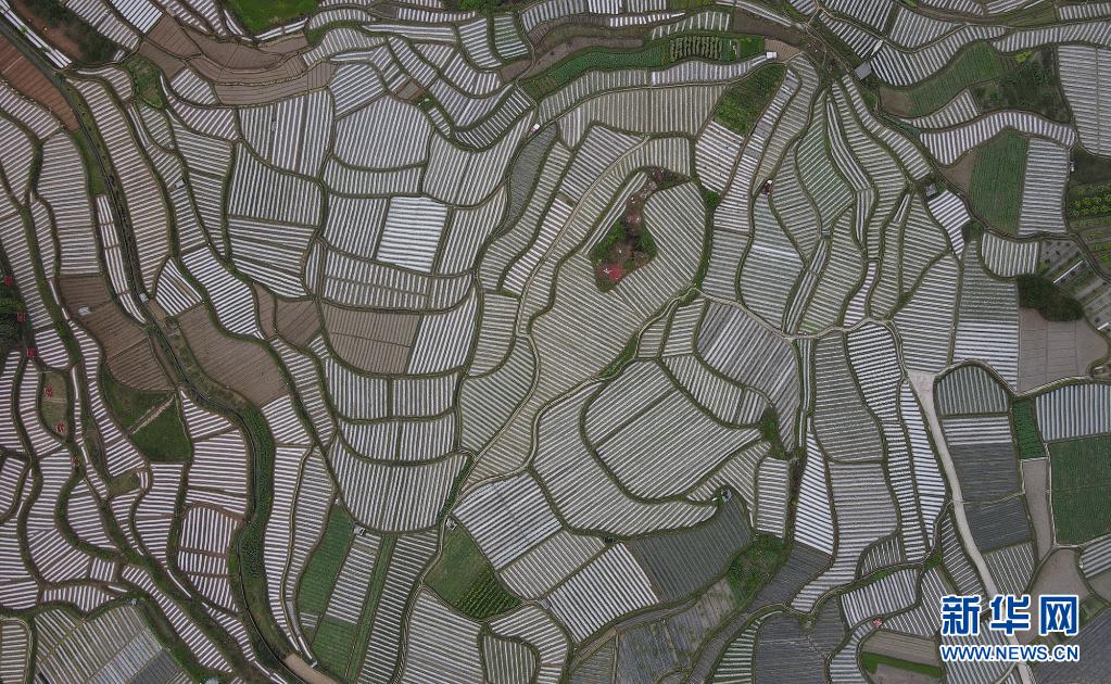 4月5日在貴州省遵義市余慶縣白泥鎮(zhèn)團結村烏楊大壩現(xiàn)代農(nóng)業(yè)蔬菜種植示范區(qū)拍攝的田園風光(無人機照片)。