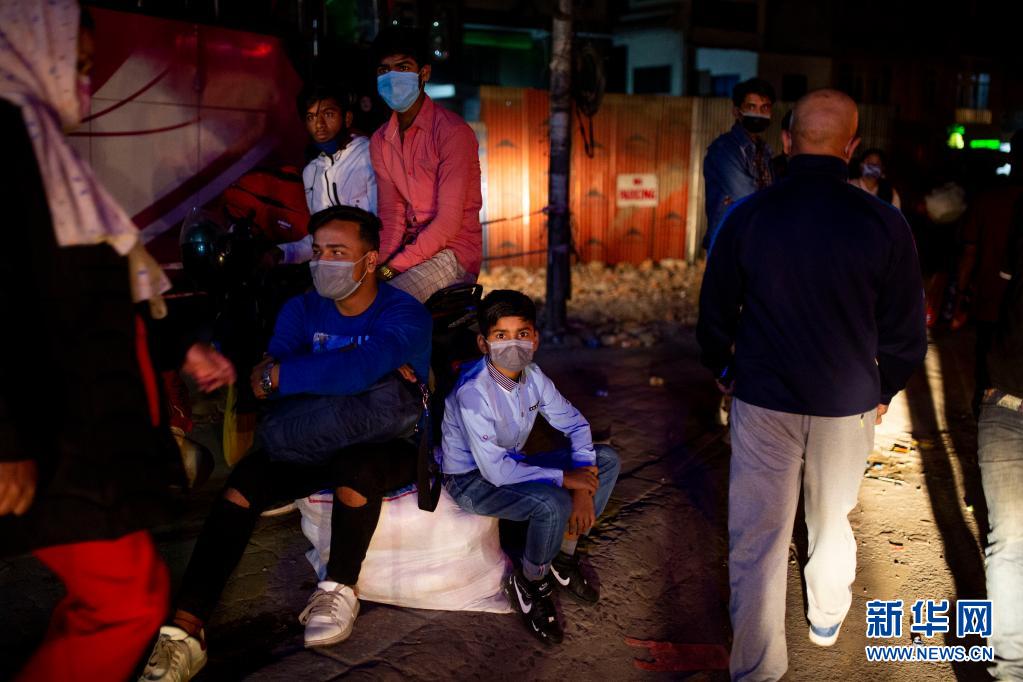 4月28日晚,人們?cè)谀岵礌柺锥技拥聺M都的路邊等車(chē),準(zhǔn)備在封禁措施實(shí)施前離開(kāi)加德滿都返回家鄉(xiāng)。