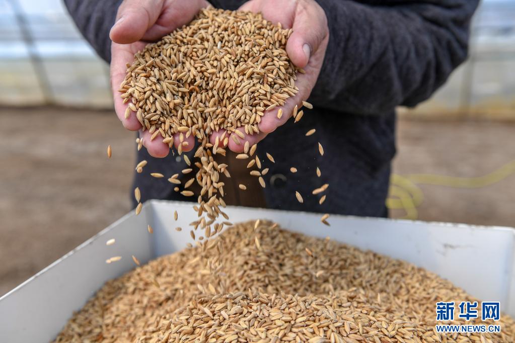 在吉林省吉林市永吉縣九月豐家庭農(nóng)場,負(fù)責(zé)人肖建波將水稻種子倒入育秧機(jī)(4月13日攝)。新華社記者 張楠 攝