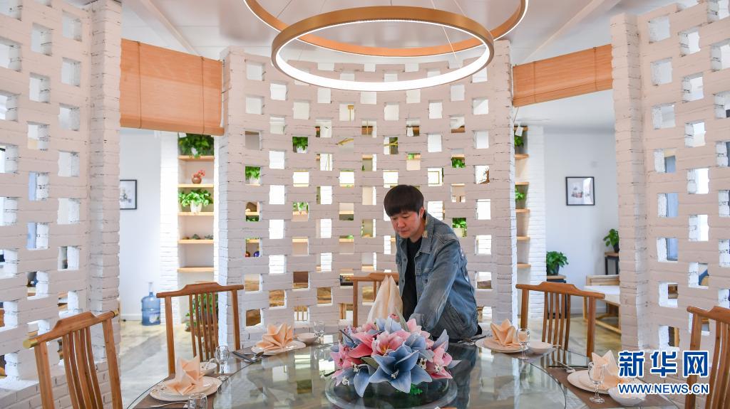 在吉林市船營區(qū)大綏河鎮(zhèn),創(chuàng)業(yè)者曹曦在民宿餐廳內(nèi)擺放餐具(4月20日攝)。新華社記者 張楠 攝