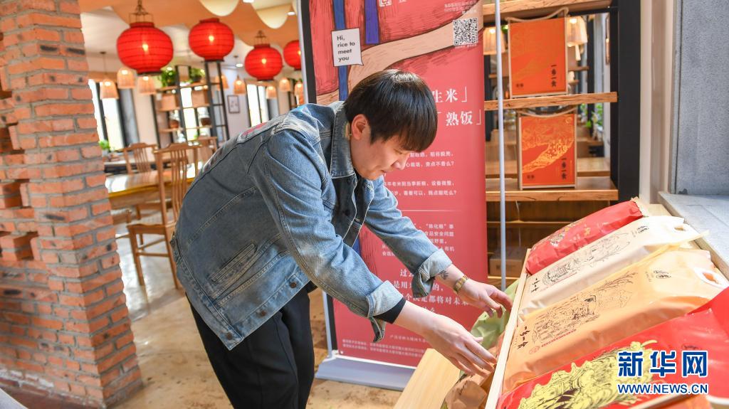 在吉林市船營區(qū)大綏河鎮(zhèn),創(chuàng)業(yè)者曹曦將農(nóng)場生產(chǎn)的大米擺在民宿顯眼位置進(jìn)行展示(4月20日攝)。新華社記者 張楠 攝