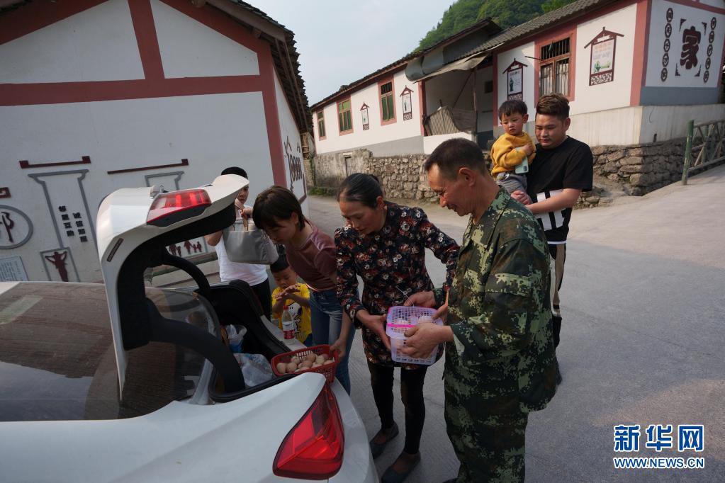 5月4日,女兒林苓一家準(zhǔn)備返程時(shí),林興聰、李蕓香夫婦給他們捎上雞蛋。 新華社記者 江宏景 攝