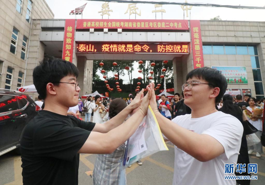 6月9日,在湖南省婁底市第二中學考點,老大李慶國(左)和老三李慶民考完最后一科生物后,在校門口相遇。