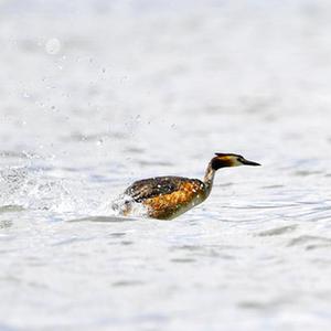 6月14日在拉魯濕地拍攝的兩只鳳頭??和一只小??(中)。夏日里,鳳頭??和小??在西藏拉薩拉魯濕地國家級自然保護區(qū)水面上嬉戲。新華社記者 張汝鋒 攝