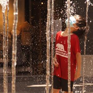6月16日,美國(guó)加利福尼亞州洛杉磯市民在噴泉旁戲水納涼。加州南部本周迎來(lái)今年的首次高溫天氣。