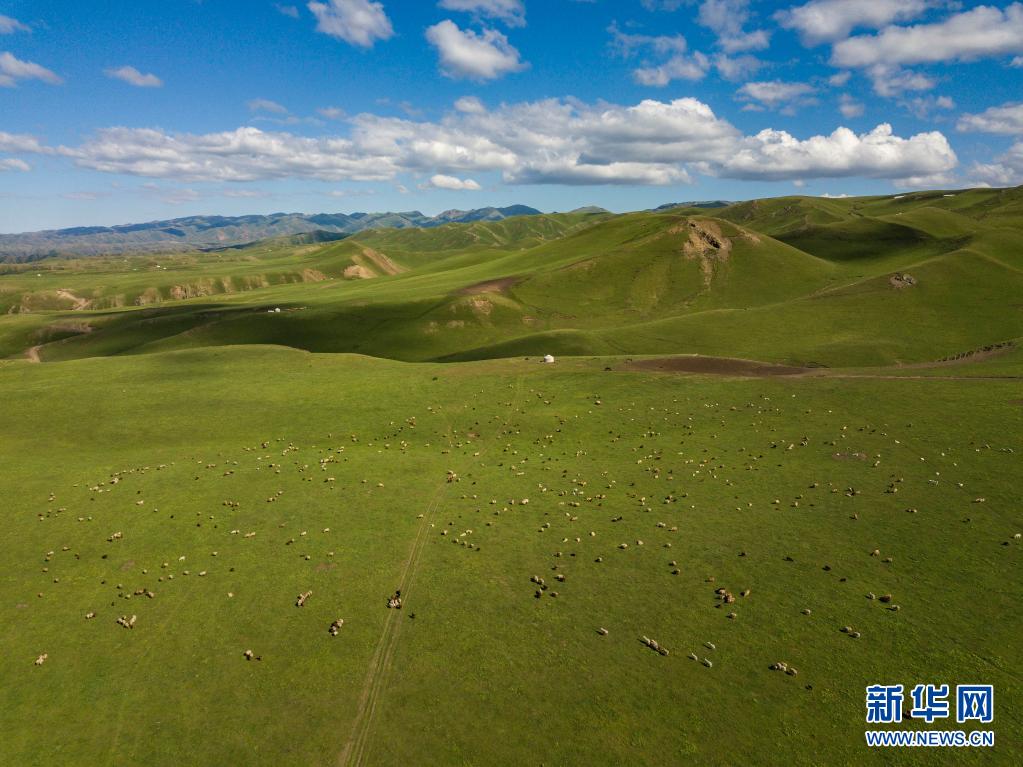 新疆裕民縣巴爾魯克山區(qū)夏牧場(chǎng)上的牛羊、氈房(6月15日攝,無人機(jī)照片)。