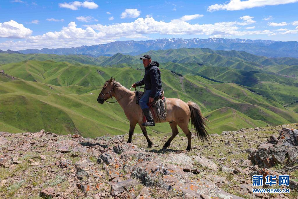 新疆裕民縣的牧民騎馬行進在巴爾魯克山區(qū)夏牧場上(6月15日攝)。