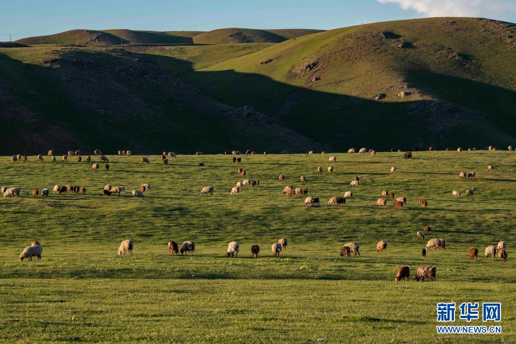 新疆裕民縣巴爾魯克山區(qū)夏牧場(chǎng)上的羊群(6月15日攝)。