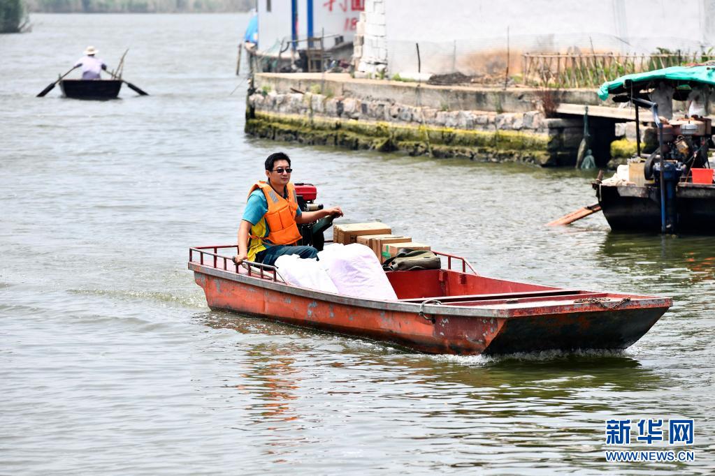 6月20日,在微山縣南陽(yáng)鎮(zhèn),郵遞員王少朋駕駛郵船為柳溝村村民投遞郵件。