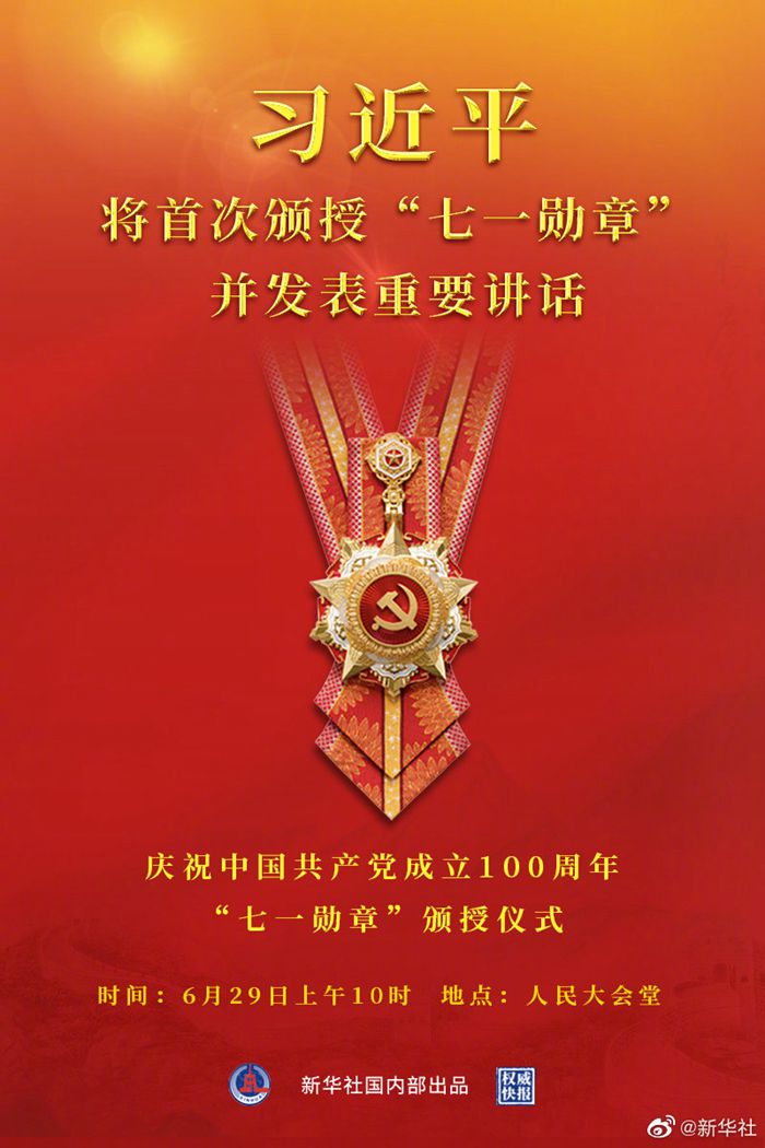 慶祝中國共產(chǎn)黨成立100周年“七一勛章”頒授儀式將于29日上午10時在人民大會堂隆重舉行。習(xí)近平為“七一勛章”獲得者頒授勛章并發(fā)表重要講話。
