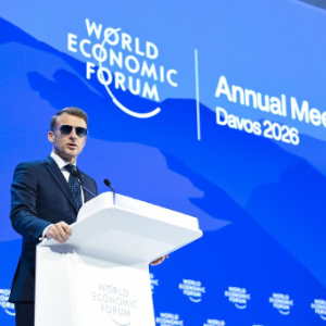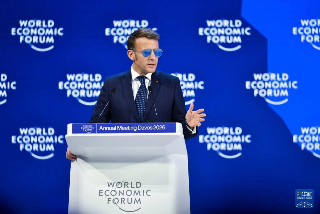 1月20日,法国总统马克龙在瑞士达沃斯举办的世界经济论坛2026年年会上讲话。新华社记者 连漪 摄