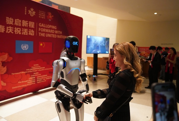 2月9日,在联合国总部举行的“骏启新程”新春庆祝活动上,一名嘉宾和机器人握手。新华社记者张凤国摄