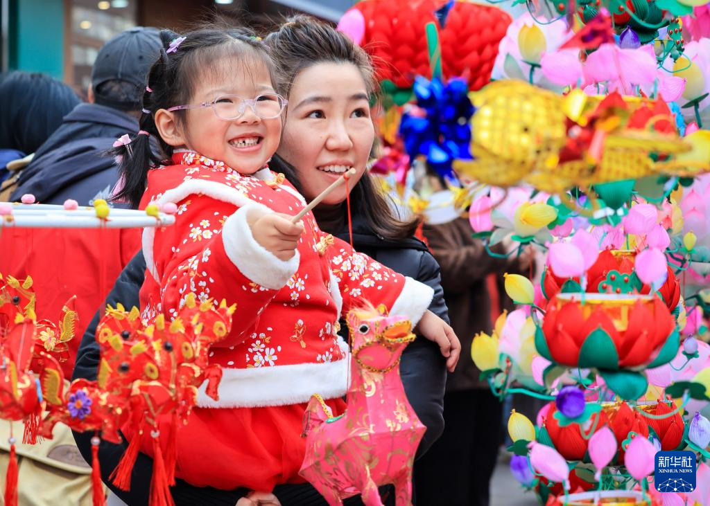 2月17日,家长和小朋友在南京夫子庙花灯市场挑选花灯。