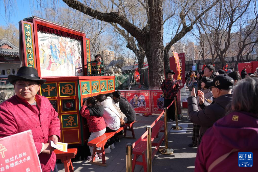 2月17日,市民和游客在北京龙潭庙会上观看“拉洋片”。
