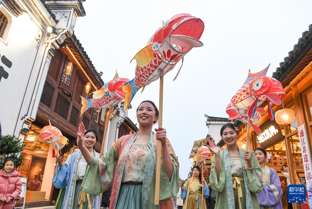 2月17日,在浙江省金华市浦江县东街,巡游的鱼灯队伍给人们送上新春的祝福。