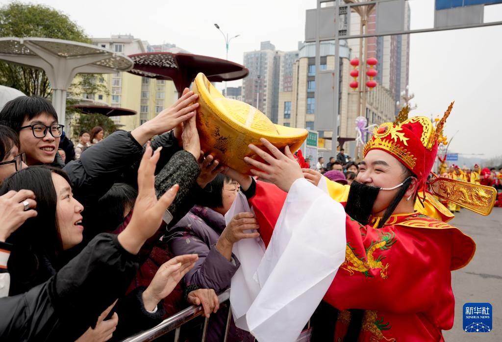 2月17日,在四川省华蓥市举行的群众文化巡游活动上,巡游演员与市民互动。