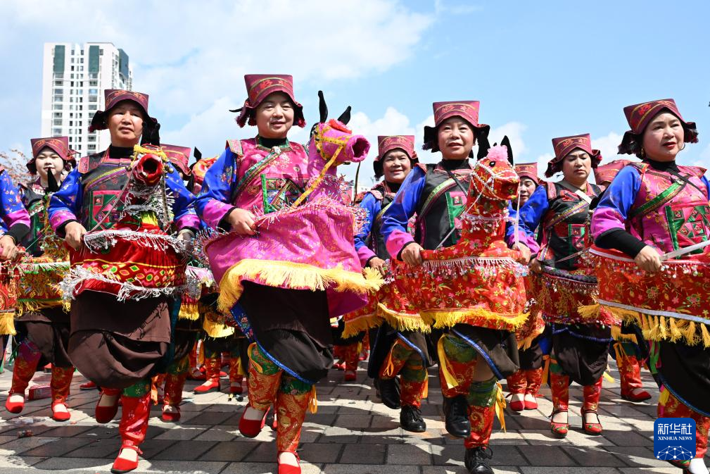 2月17日,当地群众在云南省文山壮族苗族自治州文山市步行街表演壮族纸马舞。