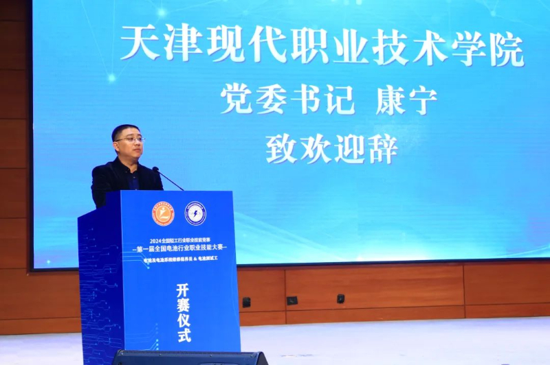 2024年12月7日,2024年全国轻工行业职业技能竞赛——第一届全国电池行业职业技能竞赛在天津现代职业技术学院开幕。此次竞赛由中国轻工业联合会、中国电池工业协会、中国财贸轻纺烟草工会共同主办,旨在弘扬劳模精神、劳动精神、工匠精神,推动我国电池行业职业技能人才队伍建设。中国财贸轻纺烟草工会一级巡视员王双清、中国轻工业联合会执行秘书长桑叶、中国电池工业协会副理事长兼执行秘书长王建新、天津现代职业技术学院党委书记康宁等领导嘉宾出席开幕式。大赛主办、承办、协办单位负责人,参赛选手、裁判员,电池行业专家、企业、院校、培训机构,以及组委会、竞赛组、会务宣传组、志愿者等工作人员共计300余人参加了开幕式。