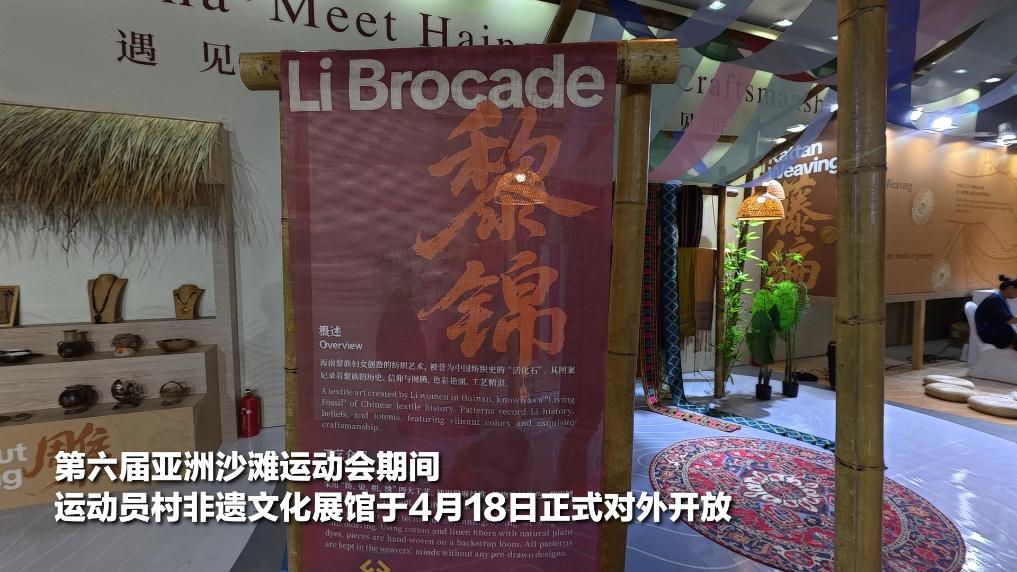 第六届亚洲沙滩运动会期间,运动员村非遗文化展馆于4月18日正式开放。展馆设置书法、传统纸鸢、剪纸、拓印技艺、黎锦、椰雕、沉香、藤编、黎陶九大展示板块。赛事还推出8场专场演出,涵盖国粹风华、海韵欢歌等主题,为运动员提供近距离体验中国非遗的文化空间。
