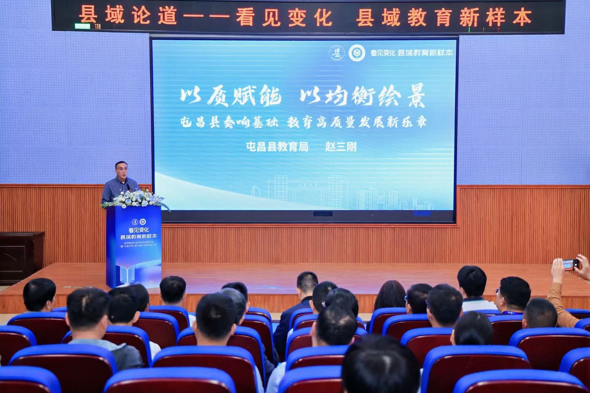 屯昌县教育局副局长赵三刚介绍县域教育治理思路,强调以党建为引领、人才为支撑、五育并举为路径,推进教育优质均衡发展。