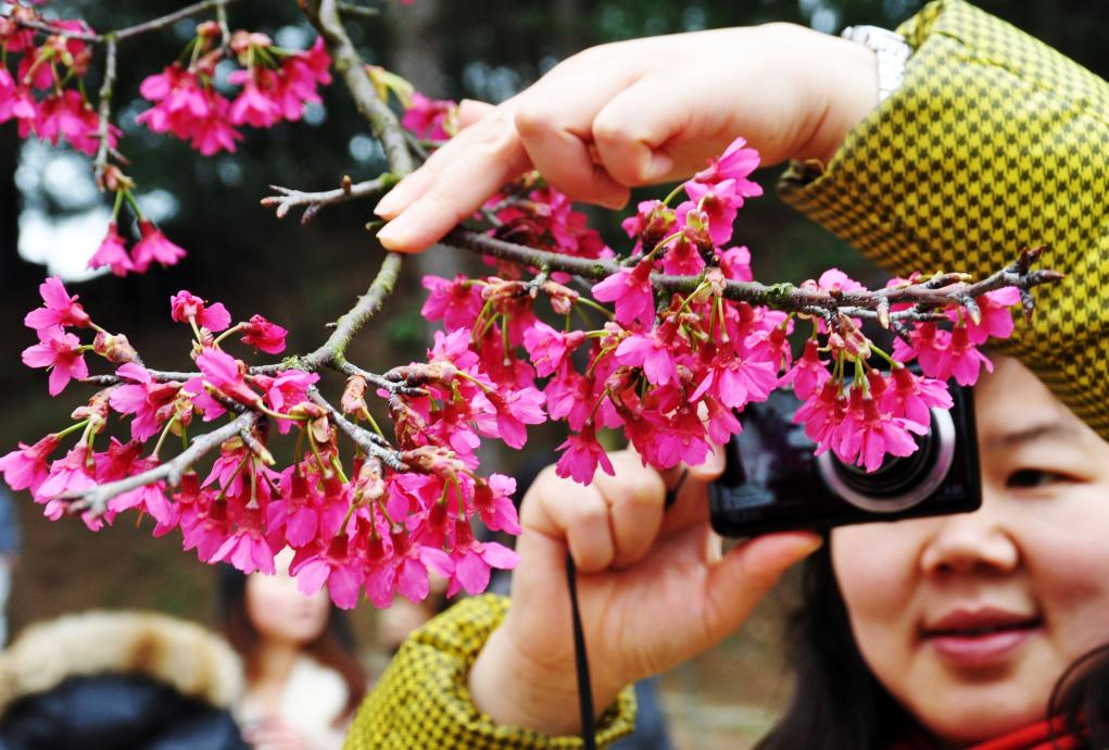 一名游客在南宁市石门森林公园欣赏樱花拍照留念(2012年2月26日摄)。
