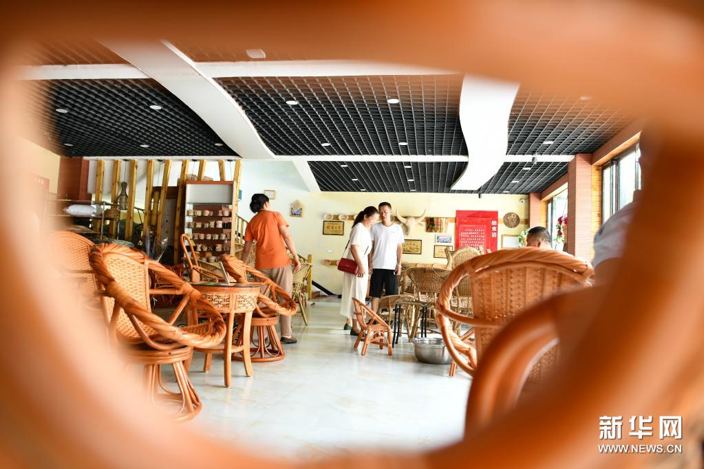 7月10日,在遵義市匯川區(qū)板橋鎮(zhèn)婁山關(guān)社區(qū),游客在一家藤編產(chǎn)品專賣店選購產(chǎn)品。藤編技藝是遵義市級非物質(zhì)文化遺產(chǎn)。近年來,貴州省遵義市匯川區(qū)板橋鎮(zhèn)采取“支部+產(chǎn)業(yè)+農(nóng)戶+旅游”的生產(chǎn)經(jīng)營模式,建立非遺工坊,成立藤編產(chǎn)業(yè)協(xié)會,開展技能培訓(xùn),開設(shè)旅游商品門面,不斷發(fā)展壯大藤編產(chǎn)業(yè),助力群眾增收。新華社發(fā)(羅星漢 攝)