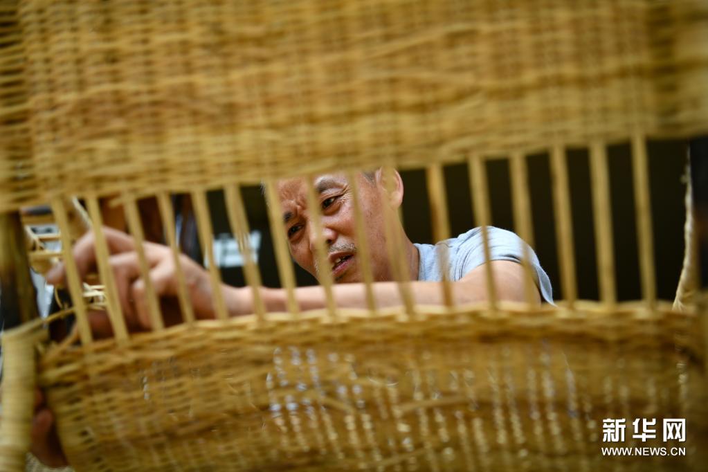 7月10日,在遵義市匯川區(qū)板橋鎮(zhèn)婁山關(guān)社區(qū),居民在藤編作坊里加工藤椅。新華社發(fā)(羅星漢 攝)
