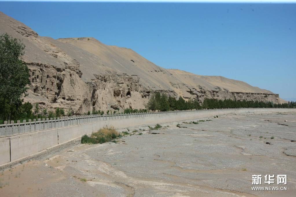 這是敦煌莫高窟北區(qū)及河邊防洪堤(7月6日攝)。新華社記者 劉詩平 攝