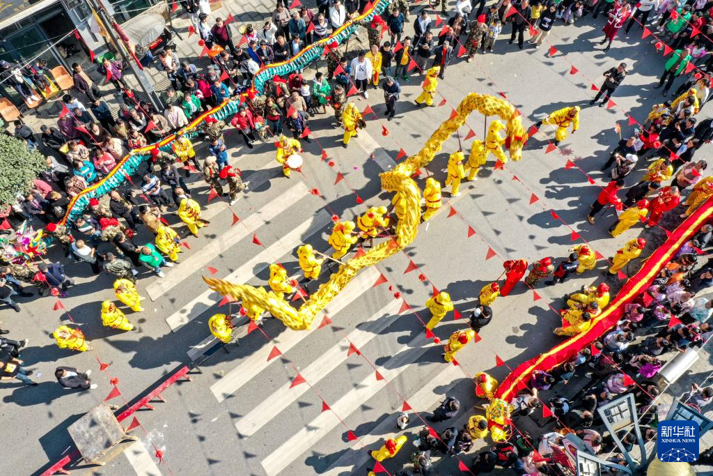 2月19日,在浙江省宁波市北仑区柴桥街道,艺人在舞龙展演(无人机照片)。