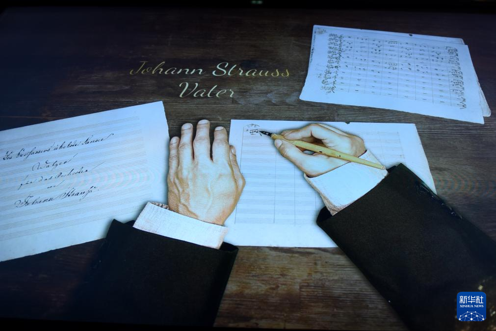 3月13日在奥地利维也纳的施特劳斯之家拍摄的展示约翰·施特劳斯谱曲的多媒体影像。