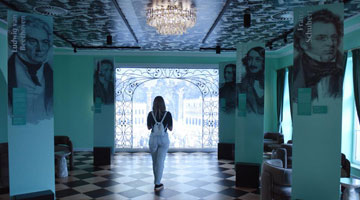 卢发良在工作室门口介绍自己以四大名著为主题创作的细纹刻纸作品(3月12日摄)。
