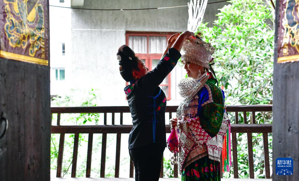 4月21日,苗族女孩们穿上节日盛装,准备参加苗族姊妹节盛装游演。