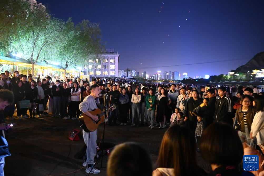 4月23日,在兰州市城关区的黄河兰州段近水平台,市民及游客观看音乐爱好者弹唱。