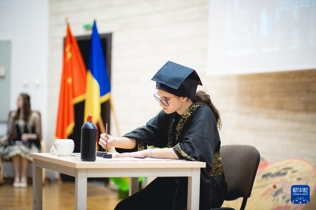 4月27日,在罗马尼亚锡比乌,特等奖获得者林娜(中文名)在第17届“汉语桥”世界中学生中文比赛罗马尼亚赛区决赛中展示中文书法。
