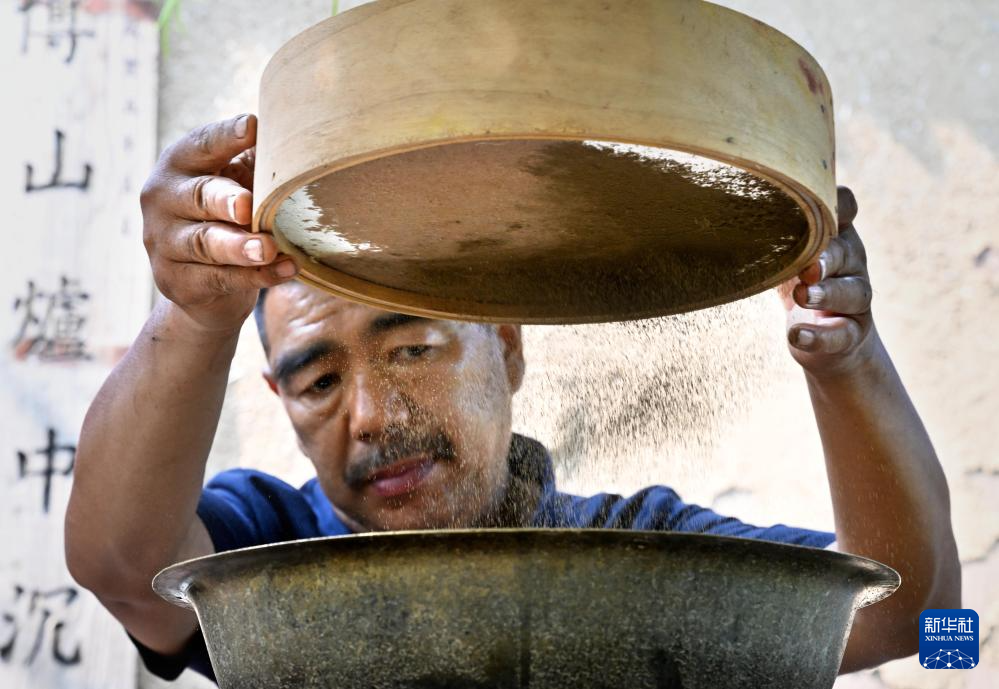 张书芳在将碾碎的香粉过筛,细粉才可以成为制作线香的香料(7月3日摄)。