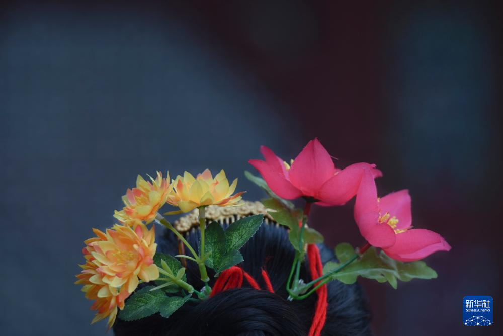 簪花时,蟳埔女先把长发扎成马尾,再将马尾盘起,用发簪固定。然后围绕发髻,环戴数层鲜花组成的花串。每逢重大节庆,蟳埔女还会在头发上插上传统样式的佩饰,以表隆重。