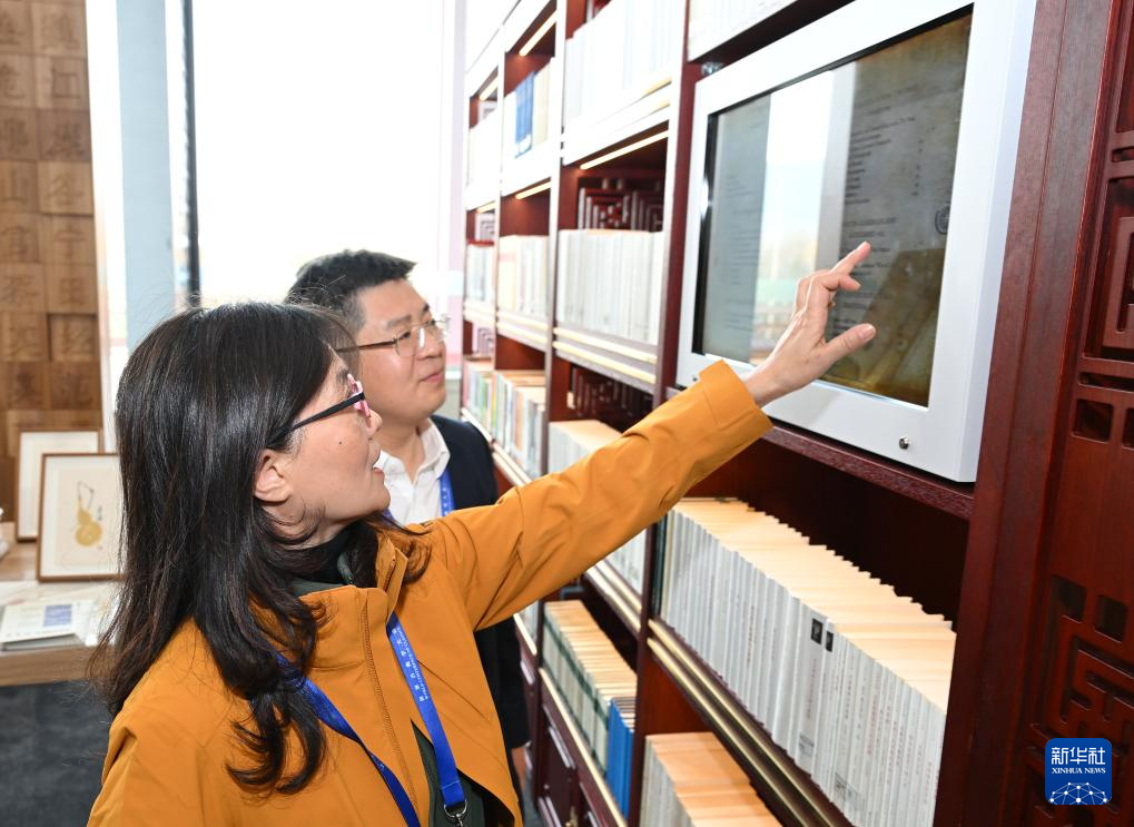11月7日,工作人员在展览现场为观众展示典籍触摸交互式体验。