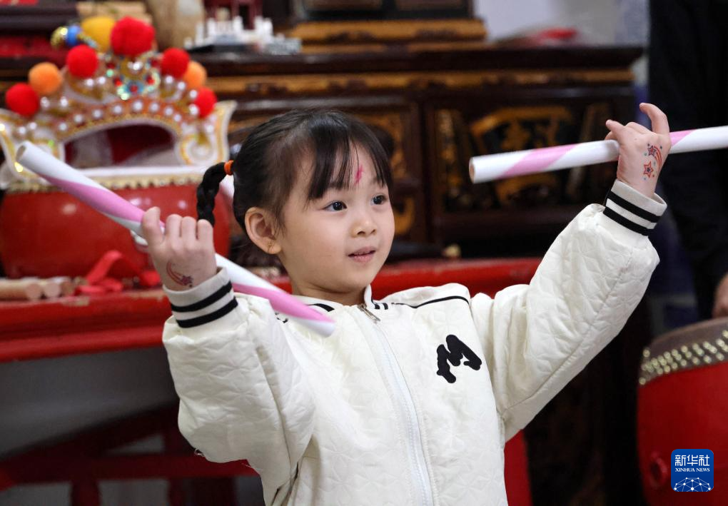 12月9日,广东省汕头市潮阳区贵屿镇玉窖村举办民俗活动,5岁女童庄恩琪手持英歌槌,跟随鼓点节奏与当地的英歌队员一同起舞,动作有力且充满韵律,赢得了在场观众阵阵掌声。