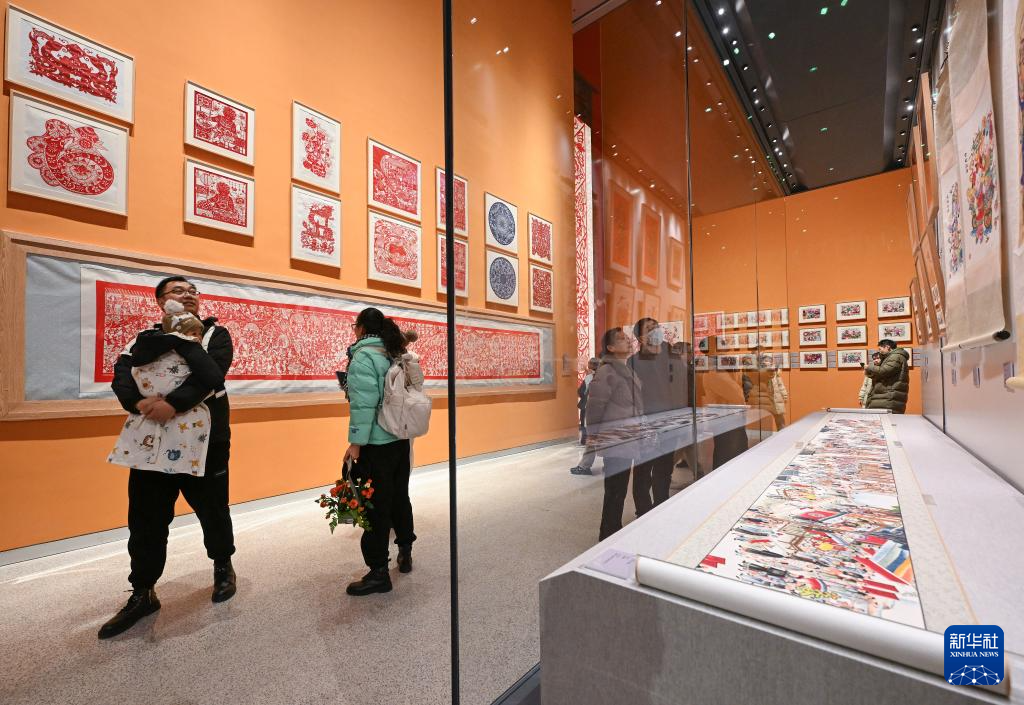 12月21日,观众在展厅内参观剪纸、年画等非遗展品。