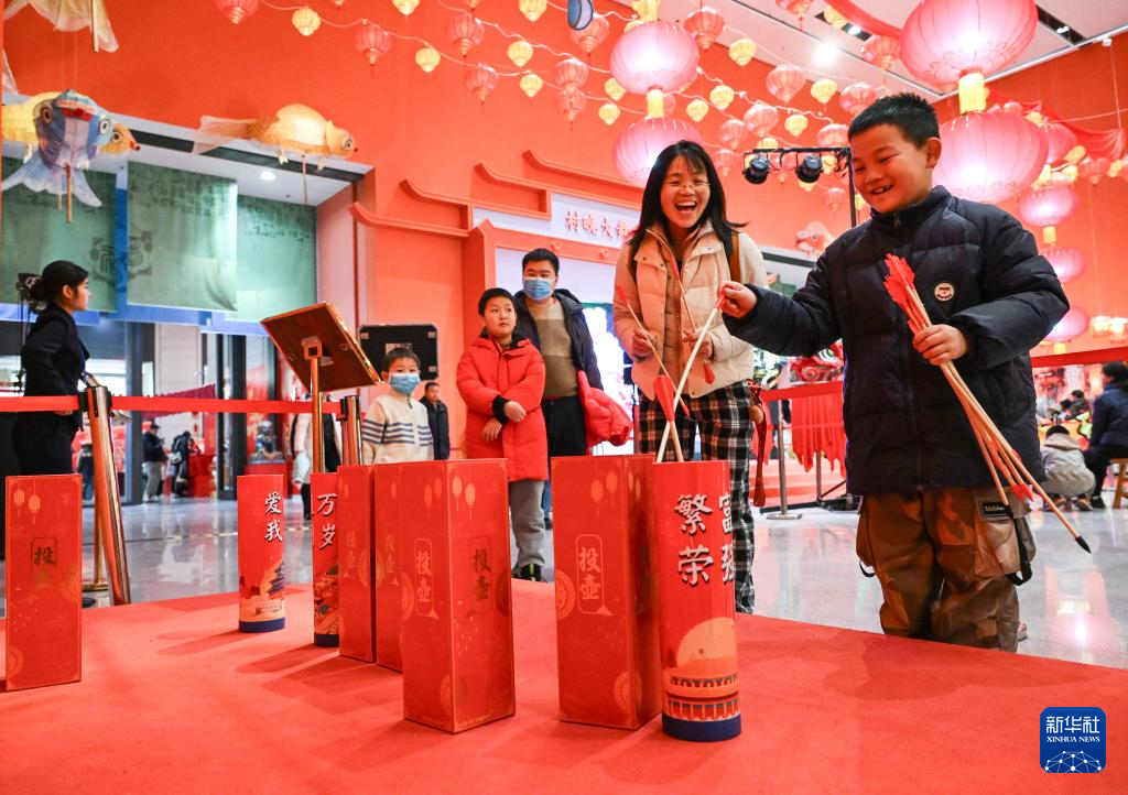 12月21日,观众在展厅内互动体验传统节日项目——投壶。
