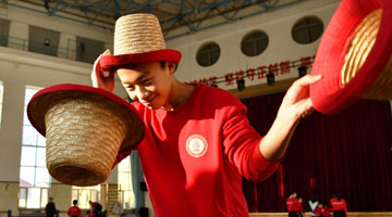 12月20日,河北省沧州市重庆路小学舞龙舞狮社团的学生们在舞狮艺人的指导下学习舞狮动作。