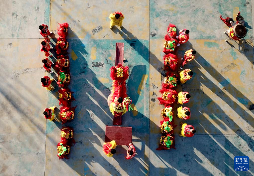12月20日,河北省沧州市沧县神韵舞狮传承基地的学员们在进行狮子滚绣球训练(无人机照片)。