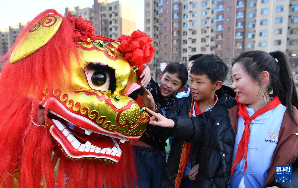 12月20日,河北省沧州市重庆路小学舞龙舞狮社团的学生在与舞狮艺人互动。