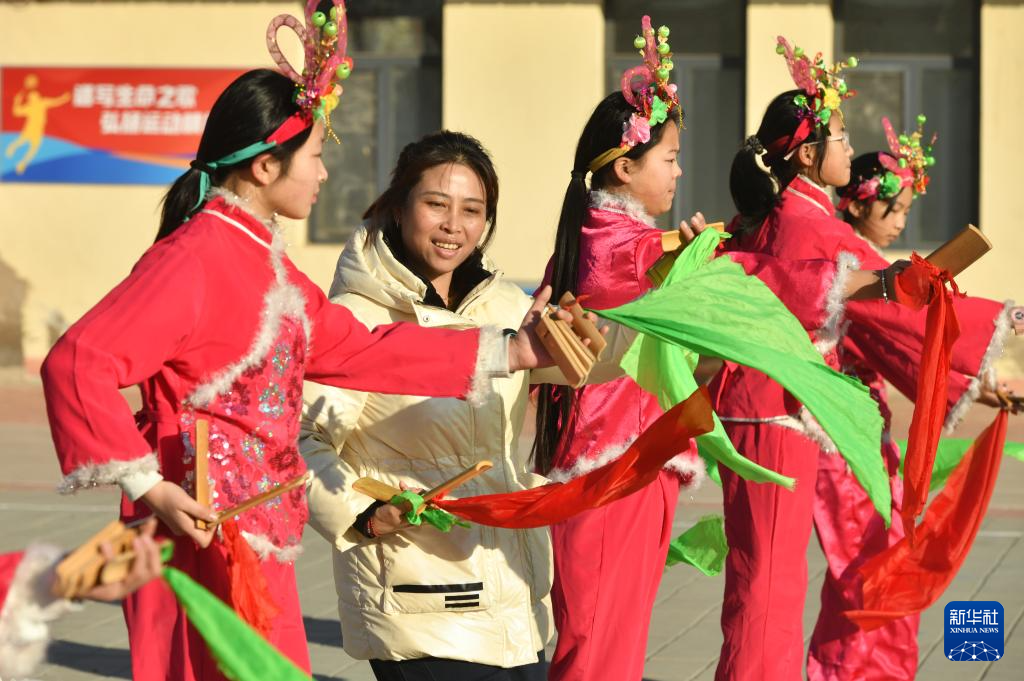12月22日,在南皮县冯家口镇车官屯小学,沧州落子艺人在指导学生练习沧州落子。